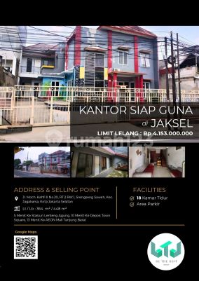 Kantor di Jagakarsa, Jakarta Selatan. For sale di wilayah yang tenang. Dengan spesifikasinya adalah sebagai berikut: - Kamar Mandi: 4 - Sertifikat: SHM - Sertifikat Hak Milik - Daya Listrik: 4400 W - Kondisi Perabotan: Semi Furnished Dan properti ini juga unggul karena: - Dekat Fasilitas Kesehatan. - Dekat Pusat Perbelanjaan. - Aset Lelang. - Cocok Untuk Investasi. - Lokasi Strategis. Keberadaan kantor ini terjangkau, hanya selangkah menuju berbagai fasilitas utama dan menarik. Dengan Rp. 4.150.000.xxx, anda dapat langsung dapatkan kantor istimewa di daerah Jagakarsa ini.