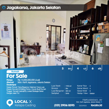 Design Rumah Yang Elegance, Halaman Yang Luas (Depan Rumah) Di Keliling Pohon, Cocok Buat Rumah Tinggal, Tempat Usaha(K3), Lokasi Strategis Dekat Dengan Jalan Tol For Sale - Jual Rumah Moh. Kahfi Jagakarsa, Jakarta Selatan Harga. Rp 1400000xxxxJual) Deskripsi Properti. Design Rumah Yang Elegance, Halaman Yang Luas (Depan Rumah) Di Keliling Pohon, Cocok Buat Rumah Tinggal, Tempat Usaha(K3), Lokasi Strategis Dekat Dengan Jalan Tol Luas Tanah. 1703 m2 Dimensi. 26x Luas Bangunan. 330 m2 Sertipikat. SHM Kamar Tidur. 5 Kamar Mandi. 4 Garasi Mobil. 6 Hadap / View. Selatan LOCAL X Kelapa Gading ******** ⓪②① ②⑨⓪⑥ ⑧⑤⑨⑤ P3KPG-0000xxxx-JW-J