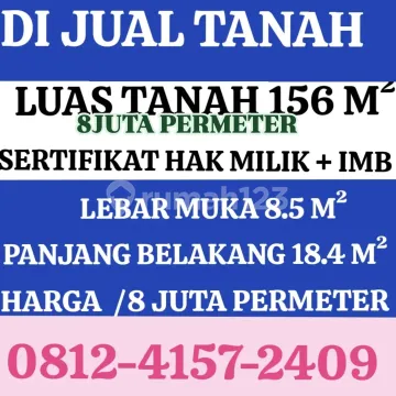 TANAH DIJUAL 156M² LEBAR MUKA 8.5 M PANJANG BELAKANG 18.4 M HARGA 8JUTA PERMETER LOKASI BEBAS BANJIR SURAT SERTIFIKAT HAK MILIK IMB 3 LANTAI UDAH ADA