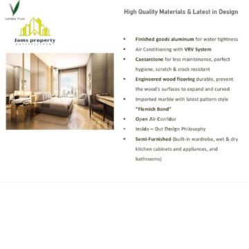 Apartment Name: Verde 2 Location: Jalan H. Cokong, Kuningan, Jakarta Selatan Tower/Floor/View: Terraverde / Apa Saja / Kota Size: 132 m2 Bedroom: 2 Bathroom: 2 Maid Room: 1 Maid Bathroom: 1 Condition: Furnitur lengkap Facility: Verde 2 menghadirkan fasilitas bintang 5 untuk memanjakan penghuninya. Fasilitas tersebut meliputi: pusat bisnis, kolam renang, ruang permainan, pusat kebugaran dan ruang perawatan, dapur dan ruang santai koki, ruang teater, ruang multifungsi, lintasan jogging, sky lounge, ruang rapat, dan ruang khusus pria. Additional Info: Berlokasi di Kuningan, Verde 2 hanya berjarak beberapa menit berkendara dari kawasan hiburan dan bisnis Jakarta, namun tetap memiliki lingkungan yang tenang dan damai. Epicentrum Walk Mall menyediakan pilihan toko bahan makanan, tempat makan & minum, dan bioskop. Untuk situasi darurat, Rumah Sakit MMC yang terkenal hanya berjarak 5 menit berkendara dari Verde 2. Sebagian besar Kedutaan Besar juga berlokasi sekitar 10 menit dari apartemen. Selling Price : 9,8 Millia Cara Bayar: Hrad Cash/ KPA