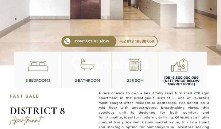 A very rare 3-bedroom apartment located in the prestigious SCBD Senopati area, offering a generous 228 sqm of living space on a high floor with stunning, unblocked city views. In Semi furnished condition, this unit is currently tenanted until 2026, providing immediate and stable rental income. Situated in one of Jakarta's most exclusive and strategic neighborhoods, it offers unmatched access to the city's top business district, fine dining, luxury malls, and lifestyle hotspots. A rare find that combines space, style, and strong investment potential in the heart of the city. Great location being at the heart of Central Jakarta in SCBD. Entrance from Jalan Senopati Raya. Strategic as it is surrounded by many other office buildings, retails, cafes, restaurants, supermarkets, and apartments. For more information and private showings : +62819xxxxxxxx