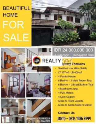 RUMAH CANTIK DI JALAN CISANGGIRI AREA KEBAYORAN BARU JAKARTA SELATAN DIJUAL : RUMAH DI JALAN CISANGGIRI AREA JAKARTA SELATAN LT : 357 m2 LB : 400 m2 JML LANTAI: 2 HADAP : SELATAN JML KAMAR : 6 KT + 3 KM MANDI : 6KM + 2 CARPORT : 4 Rumah bagus, siap huni, bebas banjir. Lokasi strategis dengan jalan raya, dekat dengan pusat bisnis, Mall, Sekolah, RS. Jual cepat, Harga masih bisa nego, Bisa KPR. (Rmh-J/11383)