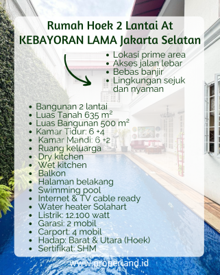 [ ] , Bangunan terawat dan siap huni Lokasi strategis Kebayoran Lama Lingkungan tenang dan nyaman Akses mudah ke area bisnis Jakarta Selatan Catatan: Owner tidak mau naik fasad KONDISI RUMAH Single House Jenis Bangunan: Secondary Semi Furnished Bangunan: 2 lantai Luas Tanah: 635 m² Luas Bangunan: 500 m² Kamar Tidur: 6 +4 Kamar Mandi: 6 +2 Ruang keluarga Dry kitchen Wet kitchen Balkon Halaman belakang Swimming pool Internet & TV cable ready Water heater Solahart Listrik: 12.100 watt Garasi: 2 mobil Carport: 4 mobil Hadap: Barat & Utara (Hoek) Sertifikat: SHM