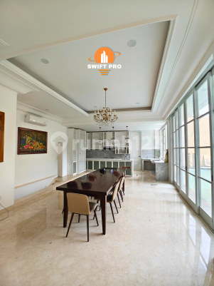 HOT SALE Harga Bisa Nego • Luas Tanah 517 m² • Luas Bangunan 760 m² (3 Lantai) • Design: American Classic • Ruang Keluarga Besar Atas/ Bawah • 6 Kamar Tidur dgn semua Kamar Mandi di Dalam • 1 Ruang Kerja/ Kantor • 1 Ruang Tamu =======+++======+++======+++====== • LIFT kapasitas 6 org • Listrik Kapasitas 23.000 watt • Double Gate • Garasi utk +-12mobil: 8 mobil indoor Basement; Plus 4 mobil Driveway • Kolam Renang + Air Terjun • Garden / Taman Luas =======+++======+++======+++====== • Lemari Pakaian Semua Kamar • 2 Powder Room Atas&Bawah • 2 Pantry Atas & Bawah Lengkap dgn Kitchen Cabinet • Service Area: 3 Kamar Pembantu(+bed&Lemari pakaian), Kamar Mandi, Gudang, Dapur+ kitchen Cabinet, Laundry Room termasuk Laundry Machine+ Dryer • Tinggi Plafon +-3,40 s/d 4m • Lantai: Marmer Sleb Besar • Tinggi Pintu 280-300cm • FULL AC Semua Rooms • Kulkas Besar/ Kecil 2 Pintu side by side ■ Lokasi Strategis ■ Level Tinggi, Bebas Banjir