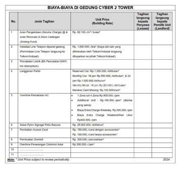 Disewakan/ For Rent, Office Space di Cyber 2 Tower, Kuningan, Size: 300m² & 321m² Gedung Cyber 2 Tower, Jl. H.R. Rasuna Said Blok X5 No. 13, Kel. Kuningan, Kec. Setiabudi, Jakarta Selatan Spesifikasi : 1. Lantai 29 Zone D, Luas : 299,01 m² 2. Lantai 30 Zone A, Luas : 321,63 m² - - - dan - - - Zone D, Luas : 299,01 m² Add info : - Service Charge : Rp. 62,100,- per m2 (fix) - Term of Payment : Quarterly in advance - Minimum Rental : 1 tahun - Security Deposit : 3 bulan Rental + Service Charge - Deposit Line Telepon : Rp. 2,500,000,- per line - Electricity : Berdasarkan Kwh meter - Kondisi : Unfurnished . - LIST BEN (Ow.9.25.ali) Harga Sewa : Rp.175 Ribu/ m² perbulan (excl Ppn) .