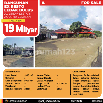 TSI/17387 For Sale Bangunan Ex Resto Lebak Bulus, Jakarta Selatan, 915 m², SHM Harga Rp 19 Milyar Alamat Jl. Lebak Lestari, Jakarta Selatan Deskripsi Properti Bangunan Ex Resto Lebak Bulus, Jakarta Selatan, lokasi strategis, dekat dengan perumahan mewah, kondisi unit baik, cocok sekali untuk tempat usaha, restaurant, SHM Luas Tanah 915 m² Dimensi - Luas Bangunan 600 m² Jumlah Lantai - Perabotan - Kondisi Baik Kamar Tidur - Kamar Mandi - Garasi / Carport - Jalur Telepon - Daya Listrik 13.300 VA Hadap / View - Sertifikat SHM LJH Realty Taman Semanan Property Help ✆ 0212903xxxx