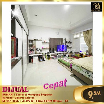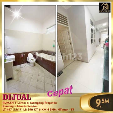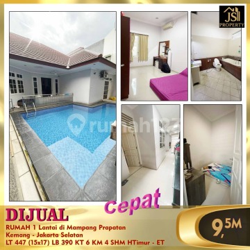 DIJUAL RUMAH 1 Lantai di Mampang Prapatan Kemang - Jakarta Selatan * Swimming Pool * Daerah Perkantoran * Dekat banyak Mall * Strategis Luas Tanah 447 m² Dimensi 15x17 m² Luas Bangunan 390 m² 1 Lantai Kamar Tidur 4 + 2 ART Kamar Mandi 4 Semi Furnish Listrik 5.500 Watt Air Sumur Bor Sertifikat SHM Hadap Timur Harga 9,5 M Nego