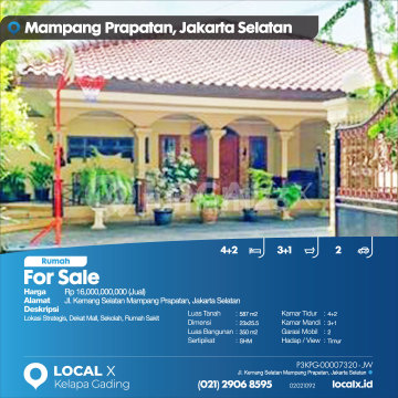 Lokasi Strategis, Dekat Mall, Sekolah, Rumah Sakit For Sale - Jual Rumah Kemang Selatan Mampang Prapatan, Jakarta Selatan Harga. Rp 1600000xxxxJual) Deskripsi Properti. Lokasi Strategis, Dekat Mall, Sekolah, Rumah Sakit Luas Tanah. 587 m2 Dimensi. 23x25.5 Luas Bangunan. 350 m2 Sertipikat. SHM Kamar Tidur. 4+2 Kamar Mandi. 3+1 Garasi Mobil. 2 Hadap / View. Timur LOCAL X Kelapa Gading ******** ⓪②① ②⑨⓪⑥ ⑧⑤⑨⑤ P3KPG-0000xxxx-JW-J