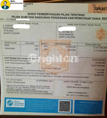 413. Murah Dijual Rumah Usaha Gudang Pabrik Setia Budi Jakarta Selatan Murah ex Toko Bunga Keunggulan : - Lokasi Sangat Strategis - Dibawah Harga Pasar! - Bebas Banjir Pastinya - NJOP Rp. 15.677.400.xxx Spesifikasi : - Legalitas : SHM - Luas Tanah : 520m² - Luas Bangunan : 1500m² - Kamar Tidur : 4 - Kamar Mandi : 4 - Lantai : 2 - Hadap : Selatan - Listrik : 4.400 - Air : Jetpump Harga Jual : Rp. 17 Miliar (Nego) Percayakan Jual/Beli/Sewa Rumah, Ruko, Apartment, Gudang, Tanah ke Mifta Brighton Siap Membantu Semua Kebutuhan Anda! More Info & Consultation : Mifta Brighton Real Estate Whatsapp 08124742xxxx ******** ******** ******** TERBAIK, TERPERCAYA, TERUPDATE, MIFTA SIAP BANTU