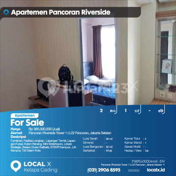 Furnished, Fasilitas Lengkap : Lapangan Tennis, Lapangan Futsal, Kolam Renang, Mini Waterboom, Lokasi Strategis, Stasiun Duren Kalibata, STEKPI Kampus , LIA Kampus, Toll Dalam Kota For Sale - Jual Apartemen Pancoran Riverside Tower 1 Lt.22 Pancoran, Jakarta Selatan Harga. Rp 365,000,000 (Jual) Deskripsi Properti. Furnished, Fasilitas Lengkap : Lapangan Tennis, Lapangan Futsal, Kolam Renang, Mini Waterboom, Lokasi Strategis, Stasiun Duren Kalibata, STEKPI Kampus , LIA Kampus, Toll Dalam Kota Luas Tanah. 36 m2 Dimensi. - Luas Bangunan. 36 m2 Sertipikat. PPJB Kamar Tidur. 2 Kamar Mandi. 1 Garasi Mobil. - Hadap / View. Toll LOCAL X Kelapa Gading ******** ⓪②① ②⑨⓪⑥ ⑧⑤⑨⑤ P3KPG-0000xxxx-EW-J