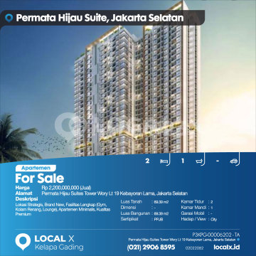 Lokasi Strategis, Brand New, Fasilitas Lengkap (Gym, Kolam Renang, Lounge), Apartemen Minimalis, Kualitas Premium For Sale - Jual Apartemen Permata Hijau Suites Tower Wory Lt 19 Kebayoran Lama, Jakarta Selatan Harga. Rp 2,200,000,000 (Jual) Deskripsi Properti. Lokasi Strategis, Brand New, Fasilitas Lengkap (Gym, Kolam Renang, Lounge), Apartemen Minimalis, Kualitas Premium Luas Tanah. 69.39 m2 Dimensi. - Luas Bangunan. 69.39 m2 Sertipikat. PPJB Kamar Tidur. 2 Kamar Mandi. 1 Garasi Mobil. - Hadap / View. City LOCAL X Kelapa Gading ******** ⓪②① ②⑨⓪⑥ ⑧⑤⑨⑤ P3KPG-0000xxxx-TA-J