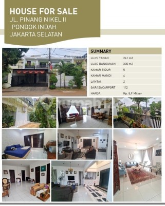 L1638 Dijual rumah siap huni jl pinang nikel pondok indah jak sel Luas Tanah : 241 Luas Bangunan : 300 Kamar Tidur : 5 Kamar Mandi : 4 Harga 8.9M #226220