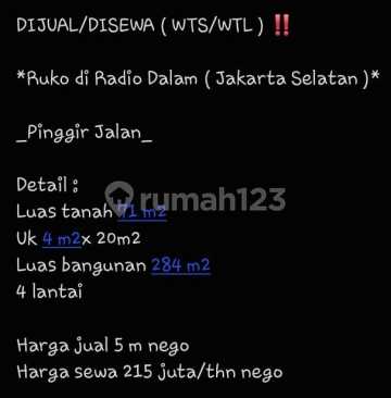 Ruko Bagus 4 Lantai Siap Huni di Radio Dalam - Jakarta Selatan "DIJUAL/DISEWA ( WTS/WTL ) *Ruko di Radio Dalam ( Jakarta Selatan )* Pinggir Jalan Detail : Luas tanah 71 m2 Uk 4 m2x 20m2 Luas bangunan 284 m2 4 lantai *Harga jual 5 m nego* *Harga sewa 215 juta/thn nego* Hubungi: Jung - 0813xxxxxxxx Gading Pro Pondok Indah #SherlyLim