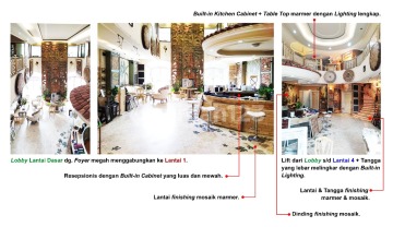 Ruko mewah 4 lantai, ceiling tinggi, lantai finishing mosaic marmer, Resepcionist dengan built ini cabinet lyas dan mewah, lift dari libu s/d lantai 4, tangga yg lebar dgn built-in lighting, tangga & lantai finishing mosaic marmer, dinding finishing mosaic, Built -in kitchen cabinet,Table top marmer dgn lighting lengkap.