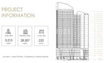 Lokasi Strategis ± 15 m dari Jl. Raya Casablanca, Jakarta Selatan Rencana awal dibangun sebagai apartemen menengah ke atas dengan total 220 unit apartment, kondisi bangunan Facade, M&E dan plumbing telah selesai ± 80%. Sangat cocok untuk dijadikan Perkantoran / Service Apartment / Hotel. Spesifikasi Properti: Luas Tanah Total : 3.215 m² Luas Bangunan (GFA) : ± 28.000 m² 25 Lantai apartemen termasuk 1 Basement Sertifikat: HGB Peruntukkan / Zonasi: K1 - Perdagangan dan Jasa Skala Kota KDB: 55%, KLB: 4,38 Landmark dalam Radius ± 500m - 1 Km: Mall Kota Kasablanka RS Brawijaya Sahardjo Apartemen Casablanca Mansion