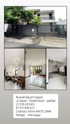Di jual rumah di tanah kusir jl daud, Kebayoran lama Luas tanah 235m2 Luas bangunan 240m2 2 lantai Kamar tidur 4 Kamar mandi 6 1 kamar ART 1 kamar mandi ART Parkir 2 mobil
