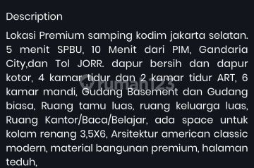 Luas tanah : 340m² Luas bangunan : 500m² NJOP Rp 4500000xxxxxxxx Kamar Tidur dan 6 toilet 3 lantai 1 Kamar ART dan toilet 1 Toilet tamu 2 Gudang Garasi 2 carport 3 Pos security, Area jemur pakaian, Taman,Listrik 5.500W, Air jet pum Akses jalan perumahan dan Jl Terusan Tanah Kusir, Lokasi berhadapan Kodim Jaksel, Pom bensin depan cluster, 5menit PIM/toll JORR/Gandaria