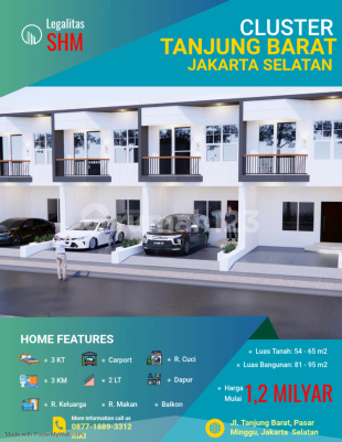 Harga Mulai dari 1,2 Milyar !!! Cluster Tanjung Barat Baru RUMAH BARU!! Lokasi Jl. Tanjung Barat, Pasar Minggu, Jakarta Selatan mengusung konsep rumah milenial modern memaksimalkan ruang dan lahan, design yg mewah dan modern, dengan bahan bangunan yg terbaik dikelasnya standard indonesia. kemudahan akses ke pusat pusat perekonomian maupun perkantoran, dekat dengan rumah sakit dan pusat perbelanjaan, milikilah segera hunian yg anda idamkan sekarang juga. Spesifikasi: Pondasi plat beton Dinding heabel (2 dinding) Lantai granit 60x60 Jendela aluminium Plafon gypsum Genteng multiroof Rangka baja ringan Luas tanah: 54 - 65 m² Luas Bangunan: 81 - 95 m² Int/eks: 3 Kamar Tidur 3 Kamar Mandi Ruang Keluarga Dapur Ruang Makan Ruang Cuci Carport (1 Mobil) 2 Lantai Balkon Legalitas SHM One Gate System Pembayaran: cash bertahap, cash keras