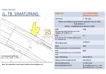 DIJUAL KAVLING 734 M² di TB Simatupang Pasar Minggu - Jakarta Selatan Luas Tanah 734 m² Dimensi 22x33 m² Sertifikat SHGB Hadap Selatan Hal yang Menarik : - Cocok untuk Buka Usaha - Area Plaza Oleos - Dekat ke MRT, Busway Harga 25 M Nego ena JS Property