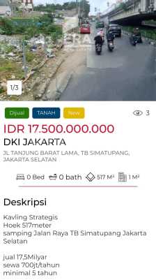Kavling Strategis Hoek 517meter samping Jalan Raya TB Simatupang Jakarta Selatan jual 17,5Milyar sewa 700jt/tahun minimal 5 tahun E1