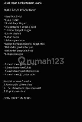 Dijual Tanah berikut tempat usaha Di tebet barat dalam No 8A Spesifikasi : Sertifikat SHM Luas : 365 m2 Sudah baja ringan 3 slot usaha 1 besar 2 kecil 1 kamar tempat tinggal Listrik pisah 4 lahan parkir jalan raya utama depan komplek regensi tebet mas dekat dengan kantor pos dekat dengan pusat kota lokasi strategis 8 menit menuju stasiun tebet 12 menit menuju kokas 15 menit menuju halte busway 4 menit menuju pasar tebet kondisi tersewa 3 usaha 1. Unclebrew coffe shop 2. The showroom vape specialist 3. Kopi konnichiwa Open price 17 M negoo...