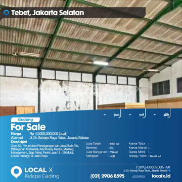 Zona K3, Peruntukan Perdagangan dan Jasa Skala SW, PBangunan Komersial, Ada Ruang Kantor, Meeting, Management, Siap Pakai, Parkir Luas 15 - 20 Mobil, Lokasi Strategis Di Jalan Raya For Sale - Jual Gudang Dr. Saharjo Raya Tebet, Jakarta Selatan Harga. Rp 4000000xxxxJual) Deskripsi Properti. Zona K3, Peruntukan Perdagangan dan Jasa Skala SW, PBangunan Komersial, Ada Ruang Kantor, Meeting, Management, Siap Pakai, Parkir Luas 15 - 20 Mobil, Lokasi Strategis Di Jalan Raya Luas Tanah. 1150 m2 Dimensi. 21x Luas Bangunan. 730 m2 Sertipikat. HGB Kamar Tidur. - Kamar Mandi. - Garasi Mobil. - Hadap / View. Barat Laut LOCAL X Kelapa Gading ******** ⓪②① ②⑨⓪⑥ ⑧⑤⑨⑤ Whatsapp/Call. Mariana - ⓪⑧①⑥④⑧③⓪⑤⑤⓪ P3KPG-0000xxxx-MT-J