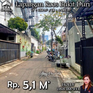 INFO LISTING - L06 RUMAH TROPIS ASRI NYAMAN LOKASI STRATEGIS LAPANGAN ROOS BUKIT DURI JAKSEL Alamat: Jl. Lapangan Roos Kel. Bukit Duri Kec. Tebet Jakarta Selatan Detail Properti: - Luas Tanah : 154 m² - Luas Bangunan : ± 285 m² Keunggulan Lokasi: - Lokasi Asri dan Nyaman Harga: Rp. 5,1 M (CASH ONLY) Harga SUDAH Termasuk Pengosongan dan Balik Nama. (Harga di atas belum termasuk BPHTB 5%, biaya lelang 2%, PPN 1%, dan PBB jika ada) **Kenapa Memilih Kami?** Dengan pengalaman 12 tahun di bidang lelang, kami menyediakan solusi satu atap untuk semua transaksi properti Anda. Proses yang jelas dan bersih sehingga Anda bisa tenang hingga serah terima. Hubungi Kami untuk Info Lebih Lanjut: - Holly: 081818xxxx - Ferry: 0816116xxxxRumahMewah #RumahdijualTebet #Rumahasri #Rumahminimalis #JakartaSelatan #BukitDuri #LapanganRoos #Tebet