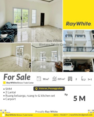 For Sale! Rumah Mewah Modern dan Siap Huni di Veteran Spesifikasi Luas tanah 90 m2 Luas bangunan 225 m2 2 KT 3+1 KM 2 lantai ruang keluarga, ruang tv, kitchen set SHM Lokasi strategis di Veteran Bintaro dekat dengan fasilitas umum seperti : - Pusat Bisnis Bintaro - Polsek pesanggrahan - RSUD Pesanggrahan - Gerbang Tol Veteran 2 - RS Dr. Suyoto - Superindo Bintaro - Stasiun Pondok Ranji Dsb Harga Rp5 M Nego *(mya)