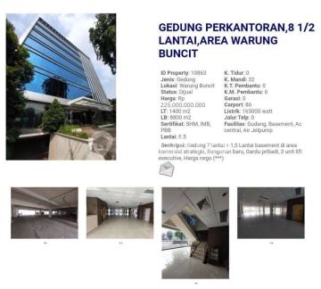 4-419. *DIJUAL GEDUNG KANTOR* *Brand New* Jl. Buncit Raya, Mampang Jakarta Selatan Sertipikat: -SHM -IMB -Luas Tanah: 1400 m2 -Luas Bangunan: +/- 8800 m2 Lantai: 8.5 lantai (termasuk Basement) Kmr Mandi: 32 kamar mandi @ 2 kmr mandi pria & 2 kmr mandi wanita set (+ 1 kmr mandi basement) Parkir sekitar 86 mobil PLN: 165.000 Wtt Telepon: 20 line Fasilitas: * 3 Lift Gold excutif kapasitas 4-5 orang /3 Unit *AC Sentral *Gardu listrik pribadi *CCTV ...unit HArga Sewa Rp 6M/Thn
