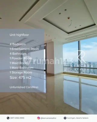 Raffles Residence Unit highfloor 4 Bedroom 1 Entertaiment Room 4 Bathroom 1 Powder Room 1 Maid Room 1 Maid Bathroom 1 Storage Room Size: 475 m2 Price: Rp 24 M Unfurnished Condition Contact Realtor: Nugroho •0817xxxxxxxx