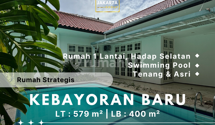 KEBAYORAN BARU - [FOR SALE]: RUMAH 1 LANTAI JARANG ADA, BANGUNAN TERAWAT, LOKASI STRATEGIS. * UNFURNISHED * Ruang Keluarga * Ruang Tamu * Ruang Makan * Kolam Renang * Teras Belakang * Dry Kitchen * Wet Kitchen Deskripsi : Luas Tanah: 579 m² Luas Bangunan: 400 m² 1 Lantai 3 Kamar Tidur 3 Kamar Mandi 3 KP, 1 KMP Listrik: 16.500 watt Carport: 2 mobil Garasi: 2 mobil Hadap: Selatan SHM, Harga: Rp 42 M (Nego) #ridhj