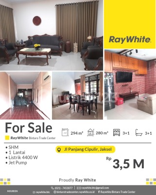 For Sale! Rumah Strategis Jakarta Selatan Murah dalam Komplek Spesifikasi Luas tanah 294 m2 Luas bangunan 280 m2 Kamar tidur 3+1 Kamar mandi 3+1 1 lantai Listrik 4400 Va Air Jetpump SHM Lokasi Strategis di Cipulir Jakarta Selatan, dekat dengan : - ITC Cipulir Mas - Pasar Cidodol - Pasar Kebayoran Lama dan Baru - Gandaria City - Pondok Indah Mall - Dsb Harga Rp3,5 M nego *(mou)