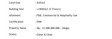 Disewakan Gedung untuk Ruang Usaha di Kemang Raya Mampang Prapatan, Kota Jakarta Selatan, DKI Jakarta Tanah : 635m2 Building Size : ±1800m2 (3 Floors) Peruntukan : F&B, Commercial & Hospitality Use Certification: Hak milik Property Value : Rp. 32.000.000.xxx Surrounding Business: Kokoon Hotels Villas, The Papilion, New Zealand School Jakarta, Jakarta Photography Center Contact Clesia wa.me/628950xxxx