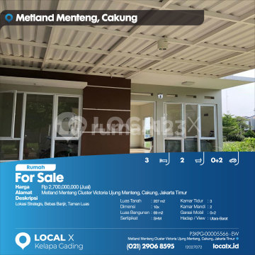 Lokasi Strategis, Bebas Banjir, Taman Luas For Sale - Jual Rumah Metland Menteng Cluster Victoria Ujung Menteng, Cakung, Jakarta Timur Harga. Rp 270000xxxxJual) Deskripsi Properti. Lokasi Strategis, Bebas Banjir, Taman Luas Luas Tanah. 207 m2 Dimensi. 10x Luas Bangunan. 69 m2 Sertipikat. SHM Kamar Tidur. 3 Kamar Mandi. 2 Garasi Mobil. 0+2 Hadap / View. Utara-Barat LOCAL X Kelapa Gading ******** ⓪②① ②⑨⓪⑥ ⑧⑤⑨⑤ P3KPG-0000xxxx-EW-J