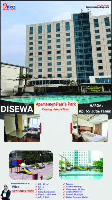 Disewa Apartemen Patria Park, Cawang, Jakarta Timur – Hunian Nyaman, Harga Terjangkau Mau tinggal di apartemen yang nyaman, strategis, dan dekat ke mana-mana? Patria Park jawabannya Detail Properti: Tipe: 2 Bedroom Luas: 45 m² Kamar Mandi: 1 Listrik: 2200 Watt AC: 3 Unit Semi Furnished: Udah ada beberapa furnitur Harga Sewa: 65 juta/tahun Lokasi Strategis: Dekat dengan Cawang dan Stasiun LRT 5 Menit ke Tol Cawang Dekat dengan Mall, Rumah Sakit, dan Supermarket Fasilitas: Keamanan 24 jam dengan CCTV Parkir luas Area hijau yang asri Kontak: Telp: 08783737xxxx WhatsApp: ******** Email: 9progading99@******** Website: ******** #ApartemenDisewa #PatriaParkCawang #ApartemenJakartaTimur #SewaApartemen #HunianNyaman #InvestasiCerdas #Cawang #SewaTerjangkau