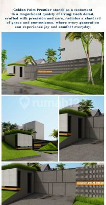 Golden Palm Premier Dikembangkan oleh PT Aulia Cahya Anugerah Abadi, yang telah sukses membangun project Golden Palm Hills. Sebuah hunian mandiri dengan total 290 unit di Sukadami Cikarang Selatan Golden Palm Premier Hadir sebagai project menengah atas namun dengan harga terjangkau agar dapat dimiliki oleh semua kalangan. Mengedepankan tiga pilar utama: modern living, easy access dan high investment return untuk dapat memenuhi kualitas kehidupan ideal yang di impikan semua masyarakat. Lokasi Sangat Strategis - 9 menit menuju tol Jatiasih - 10 menit ke RS Mitra Keluarga Jatiasih - 12 menit ke Sekolah BPK Penabur dan Pusat Kuliner Kota Wisata - 28 menit ke Bandara Halim Perdana Kusuma - 28 menit ke Terminal Kampung Rambutan - 29 menit ke Aeon Mall Jakarta Garden - 49 menit ke Cibinong City Mall Bogor - 50 menit ke Bandara Soekarno Hatta Hanya bayar 2 juta saja, Anda sudah bisa memiliki rumah yang elegan ini. Kenapa Golden Palm Premier? 1. Keamanan Terjaga Hanya 39 unit dengan konsep perumahan yang lebih private dengan sistem one gate dan ROW jalan cukup lebar. Selain itu area sekitar cluster yang aman juga terkendali 2. Kemudahan Transportasi Lokasi strategis dengan kemudahan akses untuk kemana saja, dekat dengan beragam kebutuhan hidup, serta dilalui transportasi umum 24/7 untuk beraktifitas. 3. Kenyamanan Maksimal Design rumah modern dan layout sempurna dengan konsep open space serta open flow yang menjadikan rumah nyaman untuk bermain dan beristirahat bersama keluarga. 4. Investasi Sempurna Dengan lokasi yang strategis serta dekat kemana saja, memberikan nilai keuntungan karena dampak dari kenaikan harga jual yang terus naik setiap tahunnya. Terdiri dari 2 Tipe: 1. Tipe 1 lantai Luas tanah : 54 - 109 m2 Luas bangunan : 45 m2 2 kamar tidur 1 kamar mandi Open Space High Ceiling Harga : 658 jutaan s/d 908 jutaan 2. Tipe 2 lantai Luas tanah : 69 - 97 m2 Luas bangunan : 60 m2 2 - 3 kamar tidur 2 kamar mandi Open Space High Ceiling Harga : 850 jutaan s/d 990 jutaan Grab It Fast!!! Unit Terbatas hubungi sekarang juga untuk konsultasi dan survey rumahnya (Silahkan tulis no.telp pada pesan untuk kami hubungi lebih lanjut)