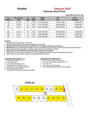 Dijual Rumah Cluster 3 Lantai DP0% Dekat TOL Bambu Apus di Sebelah Mabes TNI Cipayung Jakarta Timur Diskon : Promo harga cash terlampir di PL, KPR diskon 50 jt Bonus dan Free : Free AJB, BPHTB (SKB) Free Kanopi DP 0% Spesifikasi Luas Tanah : 71 Luas Bangunan : 130 Kamar Tidur : 3+1 Kamar Mandi : 2+1 Lantai : 3 Air : Sumur Bor Jetpump Listrik : 2200 watt Tipe : Cluster Status : indent Akses : 2 Mobil Surat : SHM Hadap Rumah : Barat & Timur Fasilitas Rumah : Rooftop, Taman Carport : 2 mobil Waktu Pembangunan : 5-8 Bulan Row Cluster : 5,5 meter Bisa Custom : bisa Unit Tersedia : 6 indent Total Unit Keseluruhan : 20 unit Tahun Pembangunan : 2023 Penambahan volume bangunan : 5,5jt/meter FKI 3142RJ PKS Bank : BSI, BRI dan Mandiri DP Minimal : 0% Booking Fee : 20jt Sale Point : 750 m ke Mabes TNI 3 km ke LRT Light Rail Transit Ciracas 3 km ke Nizamia Andalusia School 3 km ke Jakarta International Korean School JIKS 5 km ke TMII Taman Mini Indonesia Indah 4 km ke pintu TOL JORR Setu Bambu Apus Survey mohon janjian H-1 Siap Membantu Sampai Akad Hubungi kami AMANAH PROPERTY Agent Spesialis Jakarta Timur, Jakarta Selatan dan Depok