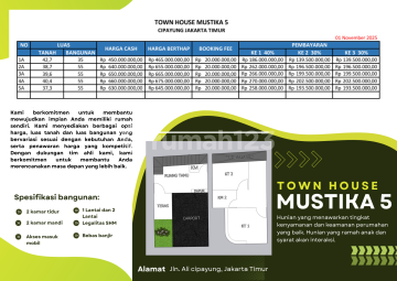 Alhamdulillah telah hadir hunian strategis dengan harga terjangkau Townhouse Mustika 5 Rumah selangkah Mc Donald Cipayung Jakarta Timur HARGA START : 450 JUTA *PROMO BULAN INI* - FREE SURAT2 - BONUS AC 1 UNIT 1/5 PK - FREE CUSTOM LAYOUT Harga 450jt 1 Lantai LT : 40,1m² LB : 35m² KT : 2 KM : 1 Dapur Ruang Keluarga Ruang Tamu Carport : No carport Listrik : 1300 Watt Sumur : Jetpum Harga 630jt 2 Lantai LT : 37,3 m² LB : 55 m² KT : 2 KM : 2 Dapur Ruang Keluarga Ruang Tamu Carport : 1 mobil Listrik : 1300 Watt Sumur : Jetpum Seling Point : deg Dekat Ke Toll Bambu apus, Toll jago, Toll setu deg Dekat Ke Bandara Halim deg Dekat Ke TMII deg Dekat Ke Mall Mall besar deg Dekat Ke Akses LRT ciracas deg Dekat Ke Akses Busway deg Dekat Ke Mc donald Cipayung deg Dekat ke Mabes deg Dikelilingi Taman Kota RPTRA Segera Hubungi: More Info : 08131384xxxxrumahdijualcipayung #rumahdijakartatimur #rumahdijualcipayungjakarta #rumahjakarta #inforumahjakarta