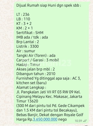 Dijual Rumah siap Huni dgn spek sbb : LT : 236 LB : 110 KT : 3 + 2 KM : 2 + 1 Sertifikat : SHM IMB ada / tdk : ada Brp Lantai : 2 Listrik : 3300 Air : sumur Tangki Air (Toren) : ada Carport / Garasi : 3 mobil Hadap : Timur Akses jalan brp mbl : 2 Dibangun tahun : 2010 Furnished Yg ditinggal apa saja : AC 3, kitchen set (baru) Alamat Lengkap : Jl. Pangkalan Jati VII RT 03 RW 09 Kel. Cipinang Melayu Kec. Makasar, Jakarta Timur 1362xxxx M dari pintu tol Pd. Gede Cikampek dan 1.5 KM dari pintu tol Becakayu), Bebas Banjir, Dekat dengan Royale Golf Harga Rp.3.650.000.xxx nego