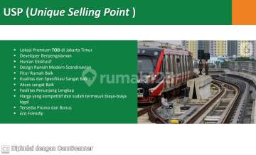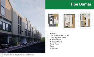 Perumahan dengan konsep modern minimalis berlokasi di Ciracas Jakarta Timur. Dengan total lahan seluas 11,298m2. KEUNGGULAN * Row Jalan 8m2 (luar) & 6m2 (dalam) * Lokasi super strategis di kawasan Transit Oriented Development (TOD) * Selangkah dari Stasiun LRT Ciracas * 1 km ke akses Busway Terminal Kampung Rambutan * 4 km ke Pintu Tol Dukuh TMII * 4 km ke Pintu Tol Gedong Pasar Rebo * 13 km ke Stasiun Kereta Cepat Woosh Halim Perdanakusuma * 11 km ke Bandara Halim Perdanakusuma Fasilitas Perumahan : * Mini Soccer * Wall Climbing * 13 Toko Kecil * 8 Toko Besar * 1 Plaza * 3 Ruko * Area Parkir * Pameran * Air Mancur * Amphitheater Fasilitas Kesehatan : * 3 km RSKO Jakarta * 4 km RSUD Pasar Rebo * 4 km Rs. Jantung Binawaluya * 4 km Rs. Adhyaksa * 5 km Rs. Harapan Bunda Fasilitas Pendidikan : * 5 km Noah * 5 km Nizamia Andalusia * 5 km Korean International * 6 km Cikal Amri * 6 km ACS Jakarta * 12 km Highscope Fasilitas Perbelanjaan : * 1 km Pasar Ciracas * 5 km Green Terrace TMII * 5 km The Amboja * 6 km Tamini Square * 8 km Trans Studio Cibubur TIPE DAMAI (3 lantai) • Luas Tanah 30 m² - 42 m² • Luas Bangunan 93 m² • Kamar Tidur 2 • Kamar Mandi 2 • Ruang Tamu • Dapur • Carport 1 mobil TIPE TENTREM (1lantai) • Luas Tanah 60 m² • Luas Bangunan 49 m² • Kamar Tidur 2 • Kamar Mandi 1 • Ruang Tamu • Dapur • Carport 1 mobil TIPE SENTOSA (2 lantai plus Rooftop) • Luas Tanah 60 m² - 83 m² • Luas Bangunan 104 m² - 116 m² • Kamar Tidur 3 • Kamar Mandi 3 • Ruang Tamu • Dapur • Carport 2 mobil •Taman Belakang * Listrik 2200 watt * Solar panel 2200 watt * Sumur Bor + Pompa Submersible * Smart Door Lock