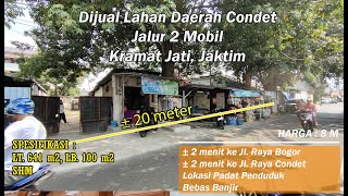 Dijual Lahan Luas Pinggir Jalan plus Rumah di Condet Jaktim masuk mobil 2 jalur. Lahan ini sangat bagus jika di bangun rumah atau tempat usaha, selain padat penduduk lokasi ini dekat kemana mana seperti sekolah, kampus, exit tol Cawang dan TMII, bandara Halim Perdana Kusuma, pasar Rindam, rindam, perkantoran, mall PGC, perhotelan, kampus Indraprasta, UKI, dan masih banyak lagi. Tanah ini juga bagus jika dibuat kontrakkan. Akses bisa melalui jalan Raya Condet atau dari Jalan Raya Bogor pasar Kramat Jati. Lokasi tidak banjir. Lokasi : Jl Masjid Al Khairat, No.02, RT.16, RW.03, Kelurahan Batu Ampar, Kec Kramat Jati, Jakarta Timur Spesifikasi Rumah : Lebar lahan 20 meteran, Bebas banjir, Luas Tanah 641 m2, Luas Bangunan 100 m2, 1 Lantai, Hadap Utara, KT 4, KM 2, Pekarangan Luas, Listrik 1300 watt, Sumber air bor, Status Surat SHM. Lingkungan Sekitar; Lokasi sekitar padat penduduk, pasar kramat jati, exit tol pasar rebo dan Cawang, kampus Indraprasta, pertokoan, perkantoran, perhotelan, rindam TNI, mall PGC, bandara Halim perdana Kusuma, dekat ke jalan raya condet, sekolah, pusat kuliner, apartemen kalibata, stasiun pasar minggu. Aksesbilitas : Mobil bisa masuk 2 mobil papasan hinga ke lokasi, ± 10 meter ke sekolahan SDN 13 Batu ampar, ± 50 meter SD dan SMP Al Khairat ± 100 meter paud Tunas Harapan, ± 1 KM kampus Unindra, ± 80 meter masjid Al Khairat, ± 1 KM Jl Raya Bogor, ± 500 meter jalan Raya Condet, ± 2 KM pasar kramat Jati, ± 3 KM exot Tol, ± 2 KM Mall PGC, ± 10 ke Rumah Sakit pasar Rebo, ± 5 menit naik Jaklingko, ± 10 menit ke Stasiun Kalibata, ± 12 menit ke Terminal kp Rambutan, ± 12 menit ke Bandara Halim Perdana Kusuma. Fasilitas dan Kelebihan Lainnya: Lokasi pada penduduk, akses kemana mana dekat, wilayah perkantoran dan kuliner, sangat strategis, aksesbilitas dekat dan banyak, dekat bandara, cocok untuk usaha seperti pertokoan, kuliner, rumah hunian dengan lahan besar sampai kontrakan. Harga : 8 M Youtube : Solusi Griya Properti Instagram : solusi.griya.properti Facebook : Solusi Griya Properti Website : ******** HP Fadli 0812xxxxxxxx