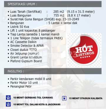 Di jual Gedung baru DEWI SARTIKA OFFICE Cawang Jakarta Timur Harga : 25M Detail Properti Spesifikasi Luas Tanah: 275 m2 (9.15 x 31.5 m) Luas Bangunan: 765 m (8.8 x 17 m) Sertifikat: SHGB Exp. 23-10-2049 Bangunan: 5 Lt & Lt Dak Daya Listrik: 50 Kva Lift: 1 unit (8 Passanger) Kamar Mandi: 1 KM tiap lantai Telekomunikasi: @1 Line telepon (Tidak Termasuk PABX) AC: AC Cassette Daikin Sanitary: Toto Air: Drilling Jetpump (Groundfos) Lantai: Granite (60 x 60 cm) Plafon: Gypsum Board Status Tersedia Fasilitas Area parkir mobil (8 Unit Mobil) Area parkir motor (10 unit) Penangkal Petir CCTV (Indoor & Outdoor) Genset (optional) Fasilitas Umum Area parkir mobil (8 Unit Mobil) Area parkir motor (10 unit) Penangkal Petir CCTV (Indoor & Outdoor) Genset (optional) Lokasi Strategis 10 menit gerbang tol cawang 10 menit tol dalam kota & jagorawi 15 menit St. Kalibata Lynnagphi
