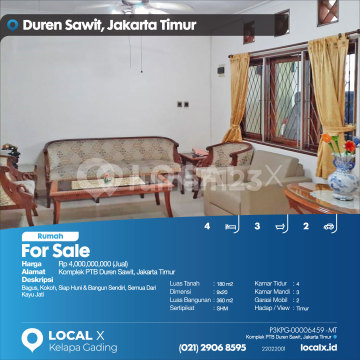 Bagus, Kokoh, Siap Huni & Bangun Sendiri, Semua Dari Kayu Jati For Sale - Jual Rumah Komplek PTB Duren Sawit, Jakarta Timur Harga. Rp 400000xxxxJual) Deskripsi Properti. Bagus, Kokoh, Siap Huni & Bangun Sendiri, Semua Dari Kayu Jati Luas Tanah. 180 m2 Dimensi. 9x20 Luas Bangunan. 360 m2 Sertipikat. SHM Kamar Tidur. 4 Kamar Mandi. 3 Garasi Mobil. 2 Hadap / View. Timur LOCAL X Kelapa Gading ******** ⓪②① ②⑨⓪⑥ ⑧⑤⑨⑤ Whatsapp/Call. Mariana - ⓪⑧①⑥④⑧③⓪⑤⑤⓪ P3KPG-0000xxxx-MT-J