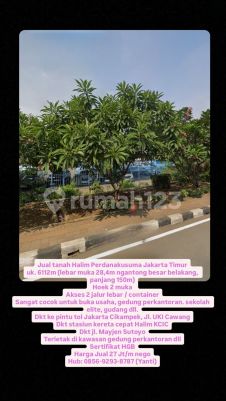 Jual tanah Halim Perdanakusuma Jakarta Timur uk. 6112m (lebar muka 28,4m ngantong besar belakang, panjang 150m) Hoek 2 muka Akses 2 jalur lebar / container Sangat cocok untuk buka usaha, gedung perkantoran. sekolah elite, gudang dll. Dkt ke pintu tol Jakarta Cikampek, Jl. UKI Cawang Dkt stasiun kereta cepat Halim KCIC Dkt jl. Mayjen Sutoyo Terletak di kawasan gedung perkantoran dll Sertifikat HGB Harga Jual 27 Jt/m nego Hub: 08569293xxxxYanti)