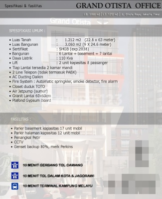 GEDUNG GRAND OTISTA OFFICE Bangunan 6 Lantai + Basement • Luas tanah (sertifikat) 1212 m2 • Luas Bangunan ± 3060 m2 (9×24 m) • Surat Hak Guna Bangunan (SHGB04082xxxx Lantai + 1 Basement = 7 Lantai • Tiap Lantai ada 2 kamar mandi • Closed duduk TOTO • Listrik +/- 164000 Watt • Air Jetpump (sumur) • 2 Line Telepon (Tidak termasuk PABX) • Hadap Timur FASILITAS : • Basement • LIFT SIGMA 1 Unit (11 orang) • AC Ducting DAIKIN • Sprinkler & Fire Alarm lengkap (Hydrant, Smoke Detector) • CCTV (Outdoor & Indoor) • Genset Perkins +/- 150 KVA • Penangkal Petir radius ex. KURN • Hadap Timur HARGA : 95 Milly Note : Isi spesifikasi diatas tidak mengikat dan dapat berubah sewaktu-waktu, tanpa pemberitahuan sebelumnya.