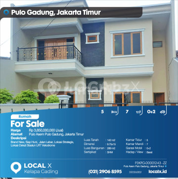 Brand New, Siap Huni, Jalan Lebar, Lokasi Strategis, Lokasi Dekat Stasiun LRT Velodrome For Sale - Jual Rumah Pulo Asem Pulo Gadung, Jakarta Timur Harga. Rp 385000xxxxJual) Deskripsi Properti. Brand New, Siap Huni, Jalan Lebar, Lokasi Strategis, Lokasi Dekat Stasiun LRT Velodrome Luas Tanah. 142 m2 Dimensi. 9.75x15 Luas Bangunan. 289 m2 Sertipikat. SHM Kamar Tidur. 5 Kamar Mandi. 7 Garasi Mobil. 0+2 Hadap / View. Barat LOCAL X Kelapa Gading ******** 0212906xxxx P3KPG-0000xxxx-ZZ-J