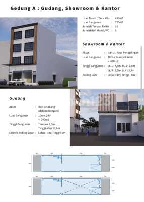 Gedung A (Gudang, Showroom, Kantor) LT (10x48) 480m2 LB total 720m2 KM 5 Parkir 10 mobil Air PAM Internet fiber optik Showroom + Kantor LB (10x12x4 Lantai) 480m2 Rolling door lebar 3meter, tinggi 4meter Luas Gudang (10x24) 240m2 Tinggi tembok 8,5meter, Tinggi atap 10,6meter Elektrik rolling door lebar 4meter, tinggi 5meter Gudang F,G,H,I LT (12x42) 504m2 LB (12x24) 288m2 KM 1 Parkir 6 mobil Tinggi tembok Gudang 8,5meter, Tinggi atap 10,6meter Elektrik rolling door lebar 4meter, tinggi 5meter Lantai cor K300 Loading dock cor K400 Area parkir cor K400 Harga mulai 11,1M nego ada RA10 #imeldaAng/GPHI Jalan row K400 One gate system Lomplek Pergudangan baru Zona Industri Akses container 40ft Bebas kuli bongkar Bebas banjir Jalan masuk lebar row 10,5meter