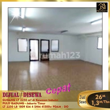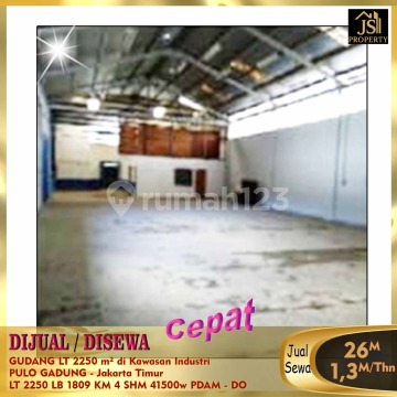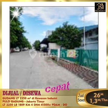 DIJUAL : GUDANG LT 2250 m² di Kawasan Industri PULO GADUNG - Jakarta Timur Dekat dengan terminal pulau gadung . Komplek industri terbesar di Jakarta Timur Luas Tanah 2.250 m² Luas Bangunan 1.809 m² Kamar Mandi 4 Listrik B2/41.500 W Air PDAM Sertifikat SHM Harga Jual 26M Nego