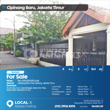 Rumah Siap Huni, Lokasi Strategis, Dekat Arion Plaza, Bebas Banjir, Keamanan 24 Jam For Sale - Jual Rumah Cipinang Baru Pulo Gadung, Jakarta Timur Harga. Rp 4,200,000,000 (Jual) Deskripsi Properti. Rumah Siap Huni, Lokasi Strategis, Dekat Arion Plaza, Bebas Banjir, Keamanan 24 Jam Luas Tanah. 180 m2 Dimensi. 10x18 Luas Bangunan. 150 m2 Sertipikat. SHM Kamar Tidur. 4 Kamar Mandi. 2 Garasi Mobil. 0+1 Hadap / View. Timur LOCAL X Kelapa Gading ******** ⓪②① ②⑨⓪⑥ ⑧⑤⑨⑤ P3KPG-0000xxxx-EI-J