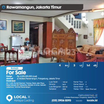 AC 1 Unit, Rumah Nyaman, Tenang, Dekat Jalan Raya, Dekat Sekolah SD Tarakanika, Sekolah Al Azhar, Sekolah Labschool, Terminal Rawamangun For Sale - Jual Rumah Mutiara Rawamangun, Pulogadung, Jakarta Timur Harga. Rp 4,500,000,000 (Jual) Deskripsi Properti. AC 1 Unit, Rumah Nyaman, Tenang, Dekat Jalan Raya, Dekat Sekolah SD Tarakanika, Sekolah Al Azhar, Sekolah Labschool, Terminal Rawamangun Luas Tanah. 140 m2 Dimensi. 9x15 Luas Bangunan. 250 m2 Sertipikat. SHM Kamar Tidur. 4 Kamar Mandi. 3 Garasi Mobil. 1+1 Hadap / View. Barat, Timur Laut LOCAL X Kelapa Gading ******** ⓪②① ②⑨⓪⑥ ⑧⑤⑨⑤ P3KPG-0000xxxx-ZZ-J